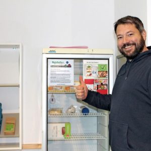 Im Eingangsbereich findet sich eine Station zum Verteilen von Lebensmittel. Hier können Sie Lebensmittel hinbringen, die noch genießbar sind. Und sich Lebensmittel mitnehmen. Mit dem Fairteiler wollen wir dazu beitragen, dass weniger Lebensmittel weggeschmissen werden.