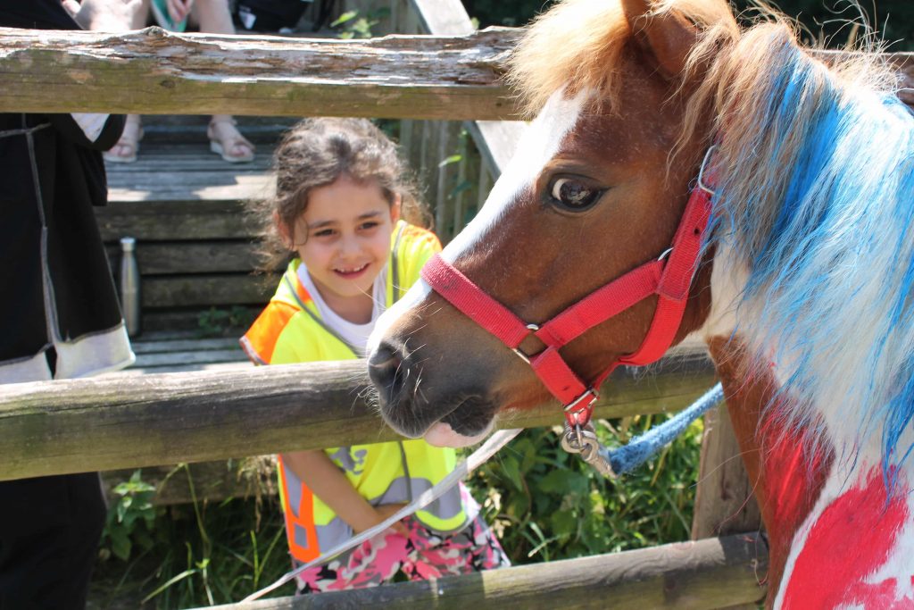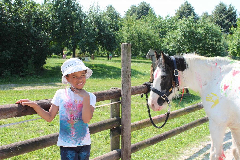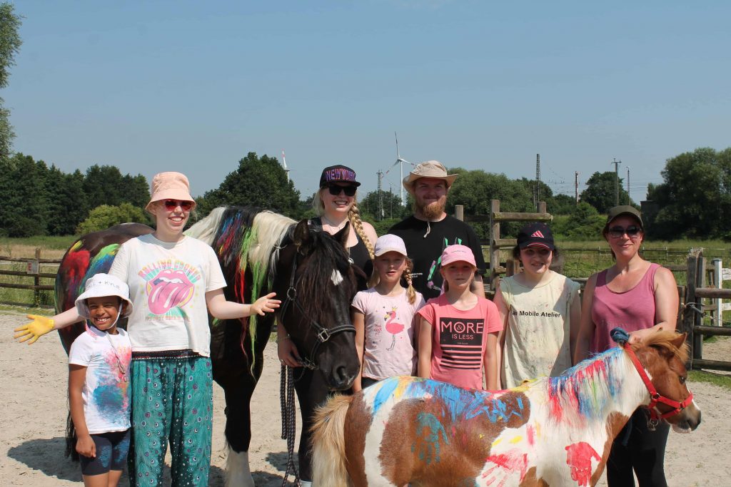Insbesondere die Ponys haben es den Kindern dabei angetan. Striegeln, Hufe auskratzen, aufsatteln, reiten, füttern: „Die Kinder waren allesamt mit großer Begeisterung dabei. Viele haben all das zum ersten Mal gemacht. Dabei haben sich ganz neue Horizonte eröffnet“, beschreibt Pia Wiesner, Sozialarbeiterin auf der Erlebnisfarm Ohlenhof, ihre Eindrücke. Als Wochenhöhepunkt wurden die Vierbeiner mit abwaschbarer Fingerfarbe angemalt. Das war ein großer Spaß für alle Teilnehmenden. Aber auch Schafe, Ziegen, Hühner und weitere Tiere wussten die Kinder zu begeistern. Zudem bietet die Erlebnisfarm Ohlenhof Spielplätze und somit die Gelegenheit, sich ordentlich auszutoben. Der anschließende Hunger konnte mit selbstgebackener Pizza und eigens hergestelltem Eis gestillt werden.