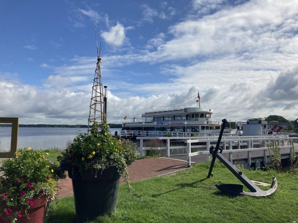 Wir fahren mit dem Schiff. Es geht zur Rundfahrt auf dem Zwischenahner Meer. Und wir bummeln durch die Einkaufsstraße. Mittags gibt es ein leckeres Essen im Restaurant.